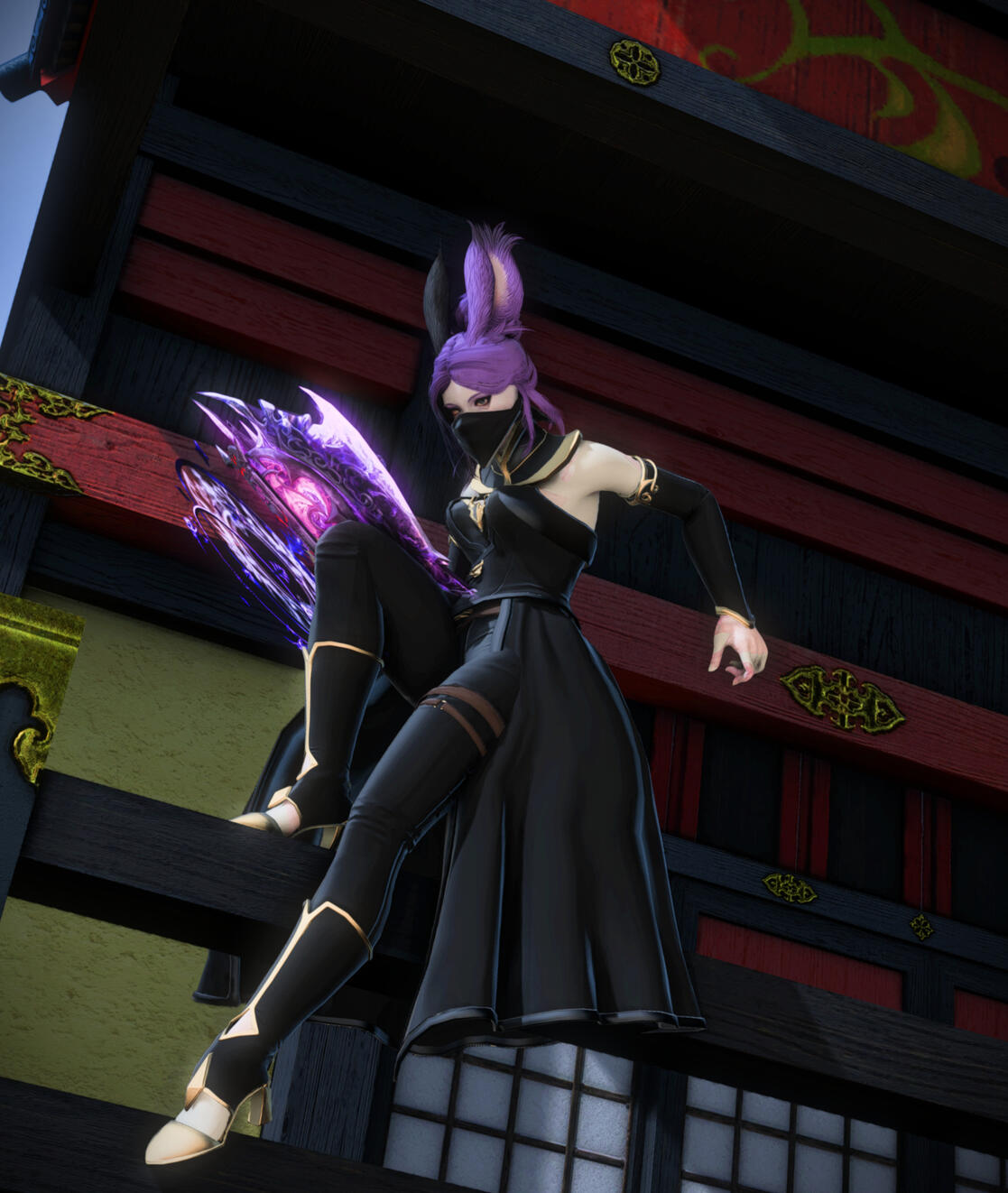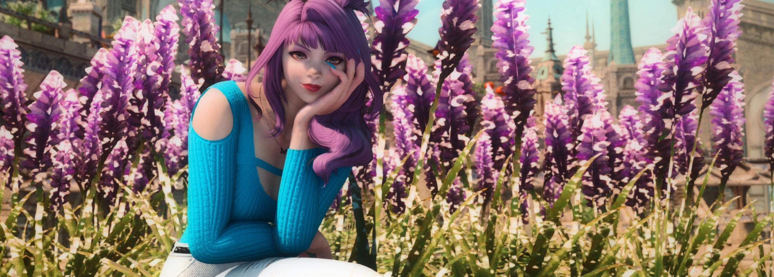 | hair. | purple + long + typically in a bun or braid |